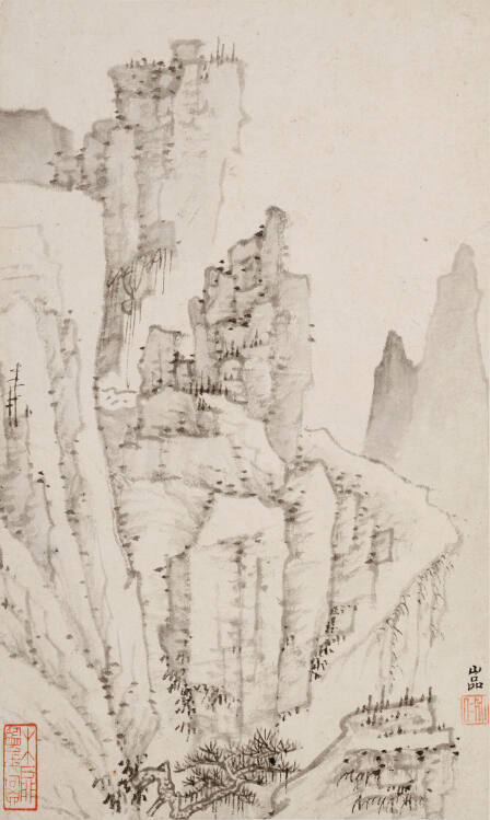 The development of Hongren's art responded mainly to two things: first, to the geometric, lithic geological formations of nearby Mt. Huang, whose spectacularly precipitous spires marveled travelers from afar; and, second, to the search, shared by many other painters of his day, for ways to recapture the monumentality of Northern Song (960-1127) landscape painting through the creation of new stylistic means that would also yield the intense graphic effects and emotional charge we find today in the leading "Individualist" masters of the time.