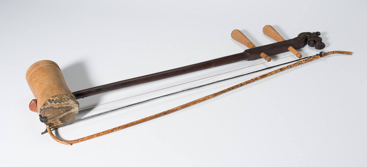 DescriptionWooden shaft with two string pegs and carved dragon head on one end. Gourd attached on opposite end. Two strings, one gut and one steel, along shaft. Bamboo bow attached.