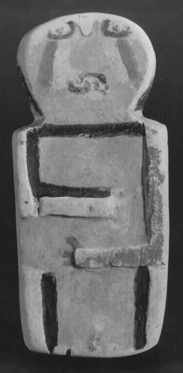 DescriptionFigure of flattened form, with sculpted legs, arms, and small nose; arms held across the front, and painted in red/brown, black, yellow, and white with fingers, genitals, body decoration, facial details, and cheek painting, and hair.