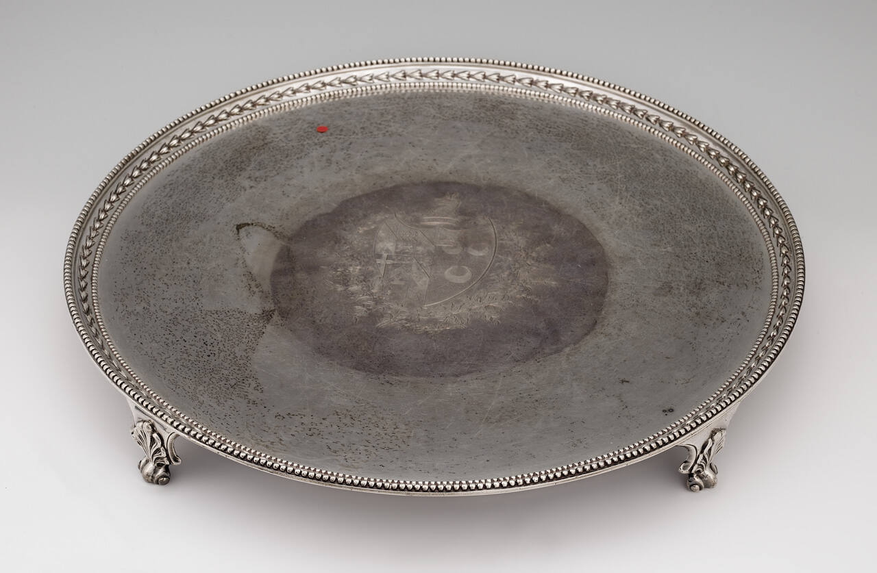 DescriptionAll three salvers with beaded edges enclosing husk border, four shaped feet decorated with shells. Centera engraved with coat-of-arms.