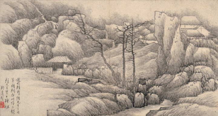 Gu Baozhuang, referenced in the artist’s inscription, was probably a fellow painter in Nanjing, a city where many artists and literate elite lived. Gong Xian uses light ink brushwork to render a tranquil scene with a winding path to a cottage. The landscape shows a stylistic “common ground” that he shares with his friend.