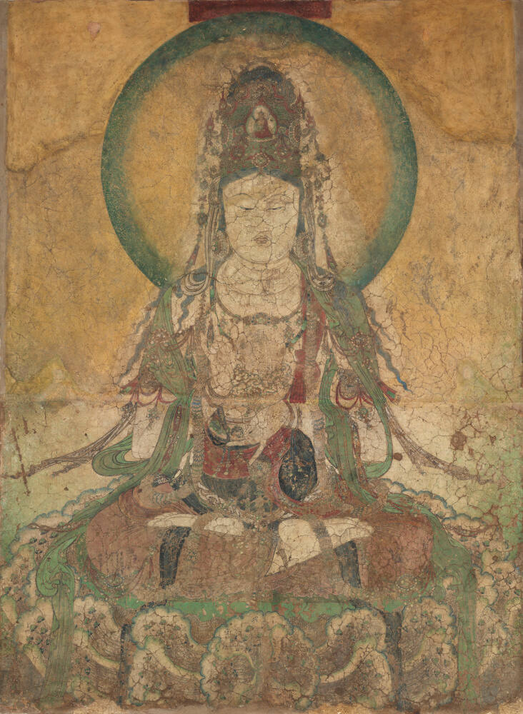 Bodhisattvas are enlightened beings who have vowed to assist others on their spiritual paths. There are many forms of bodhisattvas. This bodhisattva is known as Avalokiteshvara (Guanyin in Chinese) and can be identified by the small figure of Amitabha Buddha in the center of the high crown. The bodhisattva holds a wheel or ball f loating on clouds, and is further identified as Cintamani (wish-granting jewel) Chakra (wheel of doctrine) bodhisattva, or Ruyilun Guanyin in Chinese.