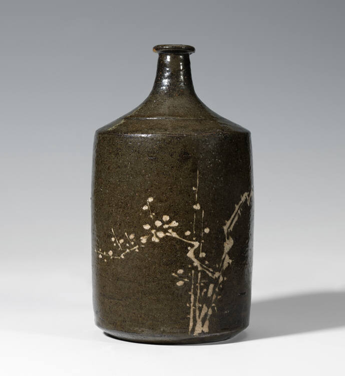 This bottle once held alcohol. After forming the shape, the artist carved the plum tree branch in the semi-hard clay. Then, the artist filled the grooves with a mixture of liquified clay known as slip. The result is a design that resembles an ink painting composed of free, spontaneous brushstrokes. This technique has roots in Korean ceramic tradition.