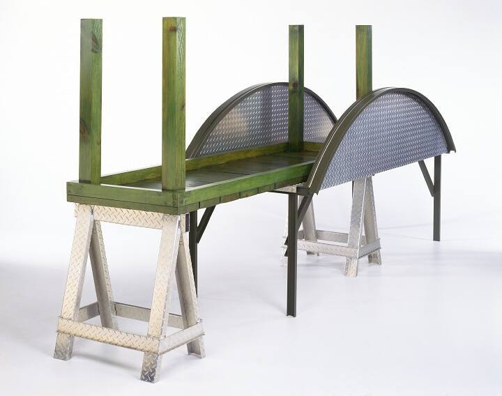 DescriptionBridge sculpture comprised of two table-like sections, each supported by one metal sawhorse. One section consists of an L-bent stell frame painted green. The top of the "table" is diamond-plated, lug-patterned, pressed aluminum. Arcs of green painted steel rise upward and span the length of both sides of this "table." These are inset with the same aluminum. The second section is of wood construction and is also painted/stained green. It is inverted with the table top resting on the sawhorse and four legs extending upward.Gallery LabelElements # 16 brings together multiple forms within one work. As a whole, the sculpture is an abstract reference to a bridge (Armajani's most enduring subject) made up of common, everyday forms such as the green, wooden parson's table and two carpenter's saw horses. In Elements # 16 the milled wood and stamped aluminum are utilitarian construction materials. The saw horses serve as supporting structures and recall Armajani's desire for functional sculpture. Both the bridge and the parson's table form that make up Elements # 16 represent objects where people meet and interact in our conflicted and divisive world.
