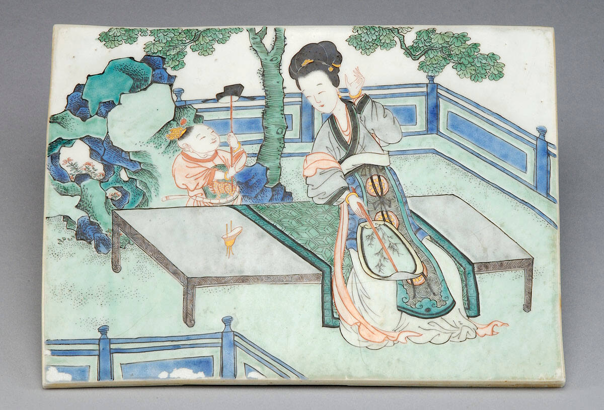 DescriptionTile done in five color Famille Verte depicting a woman and child in a garden.ProvenanceWith T. Y. King, Shanghai, China, by December 1945-1946;