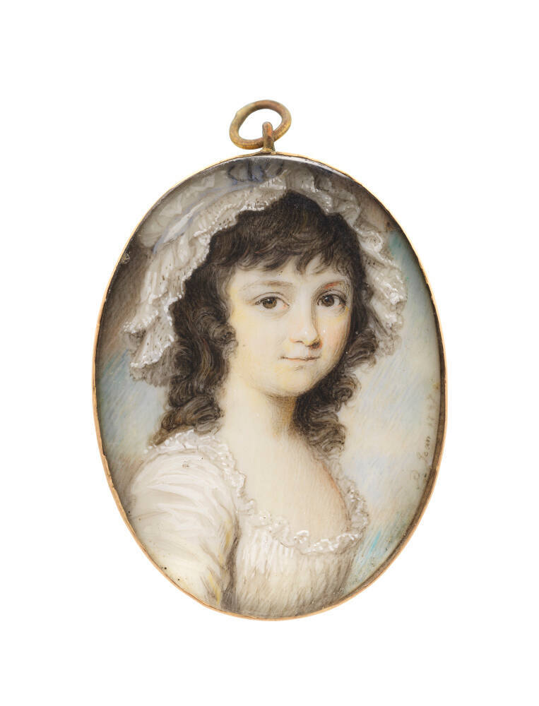 DescriptionPortrait miniature of a girl with natural hair wearing a white gown before a sky background.Exhibition History