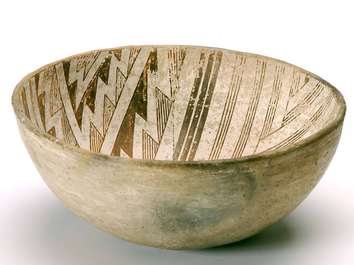 DescriptionShallow bowl with characteristic Mimbres painted geometric decoration on the interior. The design is divided into four wedges by off-set bisecting lines. Similar geometric-stepped patterns appear in each pair of opposed wedges.