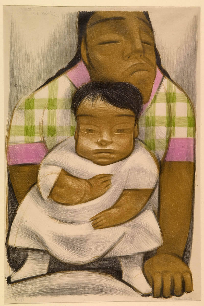 Gallery LabelParisian-born Jean Charlot accompanied his Mexican mother on her travels to Mexico City in 1921. Between 1926 and 1929, he served as the staff artist for an archaeological expedition at the pre-Columbian Mayan site Chichén Itzá on the Yucatán Peninsula. He was inspired by Mayan art and its geometric abstraction of the human figure. Mother with Child in Front reveals the impact that Mayan art had on Charlot and also expresses his connection to his own mother, with whom he made his first trip to Mexico.