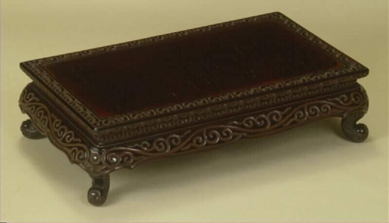 DescriptionBlack laquer table (with dark reddish-brown tinge); top with inset panel, deeply carved volutes (swordguard, chien-huan, pattern) in registers around perimeter and side margin; frieze with deeply carved volutes; shaped, curved, beaded apron with deeply carved cloud scrolls; four cabriole legs with rounded feet and carved scroll work.