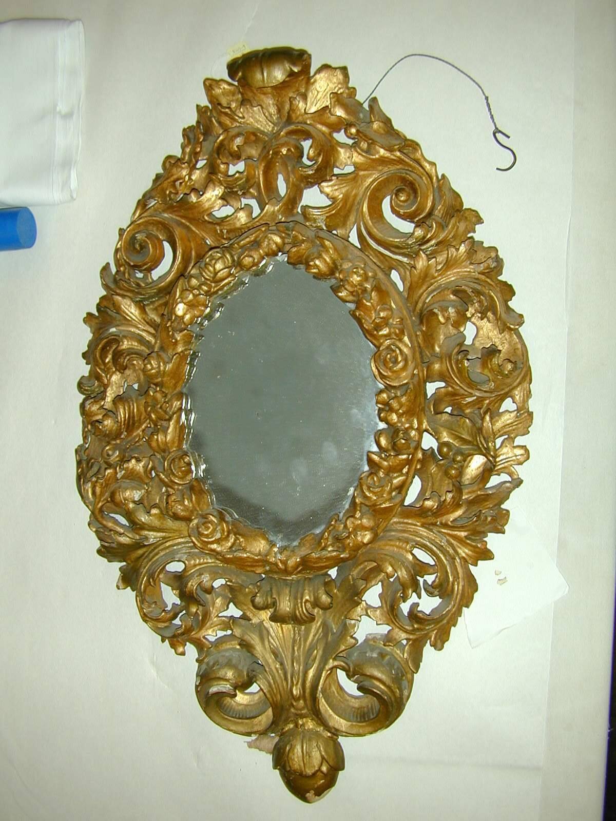 DescriptionChippendale; oval mirror surrounded by carved and gilded frame of scrolls, leaves and flowers.