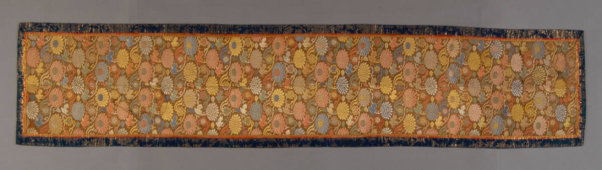 DescriptionAll-over pattern of yellow, red, blue, white and tan chrysanthemums on a dark brown satin ground. Mounted. Yellow satin lining.