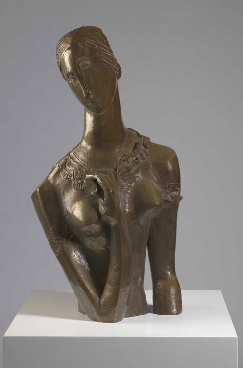DescriptionA cubist sculpture that is a portrait of a woman, angular in form, golden patina.Gallery LabelOssip Zadkine spent his formative years in Paris, where he was introduced to Cubism. Ultimately, he developed his own sculptural style by softening sharply defined, complex Cubist form.