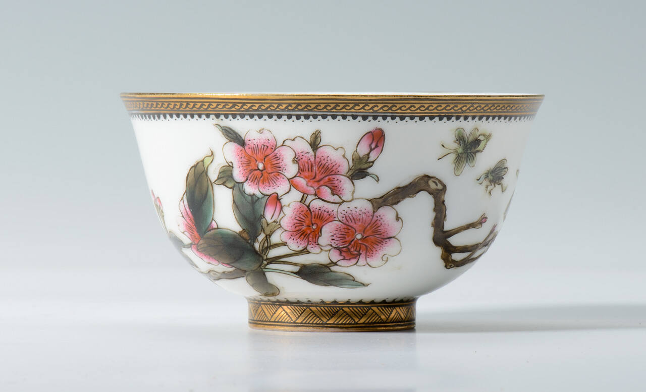 DescriptionOne of a pair of matching porcelain cups decorated wtih enamel and gilding depicting a branch with pink floral designs, flying insects, and a poem with seal. The outside lip and outsidefoot base has geometric designs in black and gold.