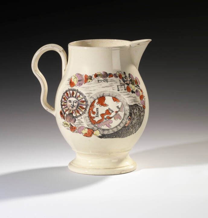 As English ceramicists incorporated motifs from contemporary prints, some artists faithfully copied the originals, while others were inspired by the compositions. Mid-18th-century technology enabled potters to use transfer-print decoration, whereby the image on a print was transferred directly to the wares by soaking it in gum arabic, as in the William Greatbatch Jug. Engravers and etchers employed by Greatbatch created prints specifically for his wares. Prints also served to customize dinner services for individual clients, as in the mermaid crest on the octagonal Platter, indicating it was made for the Scottish family Murray of Polmaise. The floral motif was most likely inspired by the 18th-century interest in plant classification and detailed prints of botanical specimens.