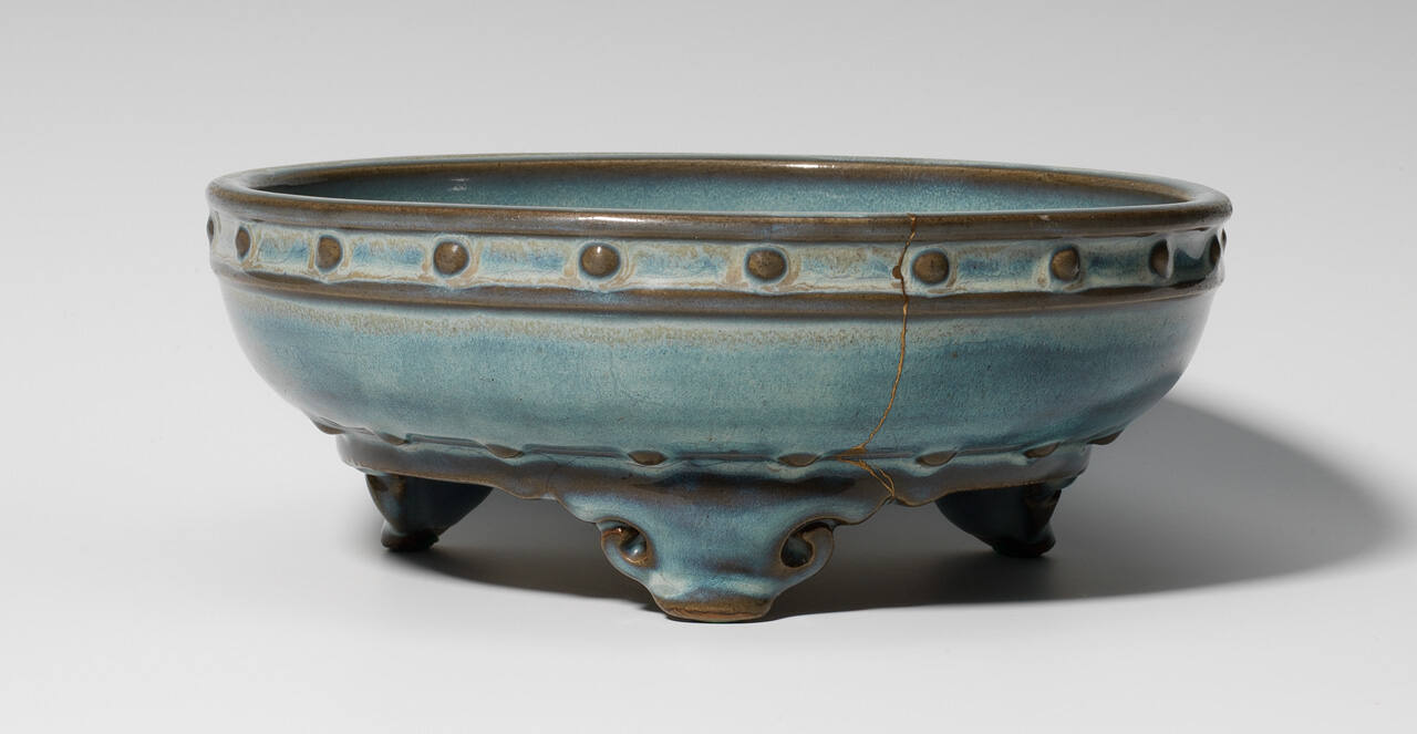 DescriptionBowl with three feet, with a bluish lavender glaze, and a band of knobs around the outer rim. Mended with gold lacquer.