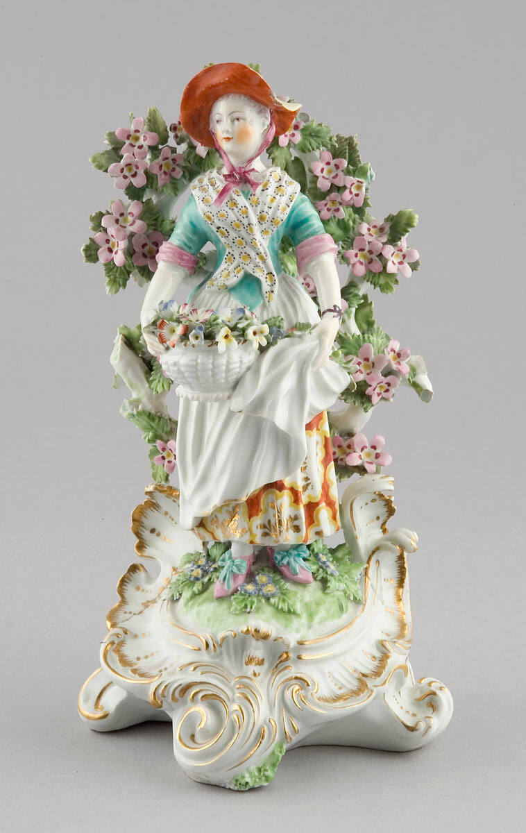 DescriptionGirl with a large brown and yellow hat, wearing a varicolored dress and white apron, stands on an irregular-shaped base wirh an arbor background of pink flowers and green leaves. She holds in her right hand a basket of flowers and in her left hand holds her apron to catch the overflowing flowers.