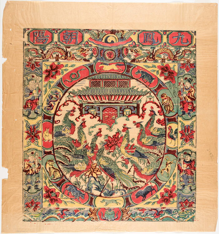 DescriptionCentral circular field with nine phoenixes facing a palace building through clouds; field has border with twelve Zodiacal animals; square borders of officials and dragons; title at top.Gallery LabelNine Phoenixes suggests that citizens are content and peaceful when a country is prosperous. Below, Wealth offers the wish for good fortune coming from every direction. The 12 animals in the borders of both prints are Chinese Zodiac animals, each representing the sign of a lunar year, which bring blessings for peace. Also in the borders are several messengers who announce the news of the coming new season and year. Prints with dense patterns like these may also be used for decoration or for wrapping gifts.