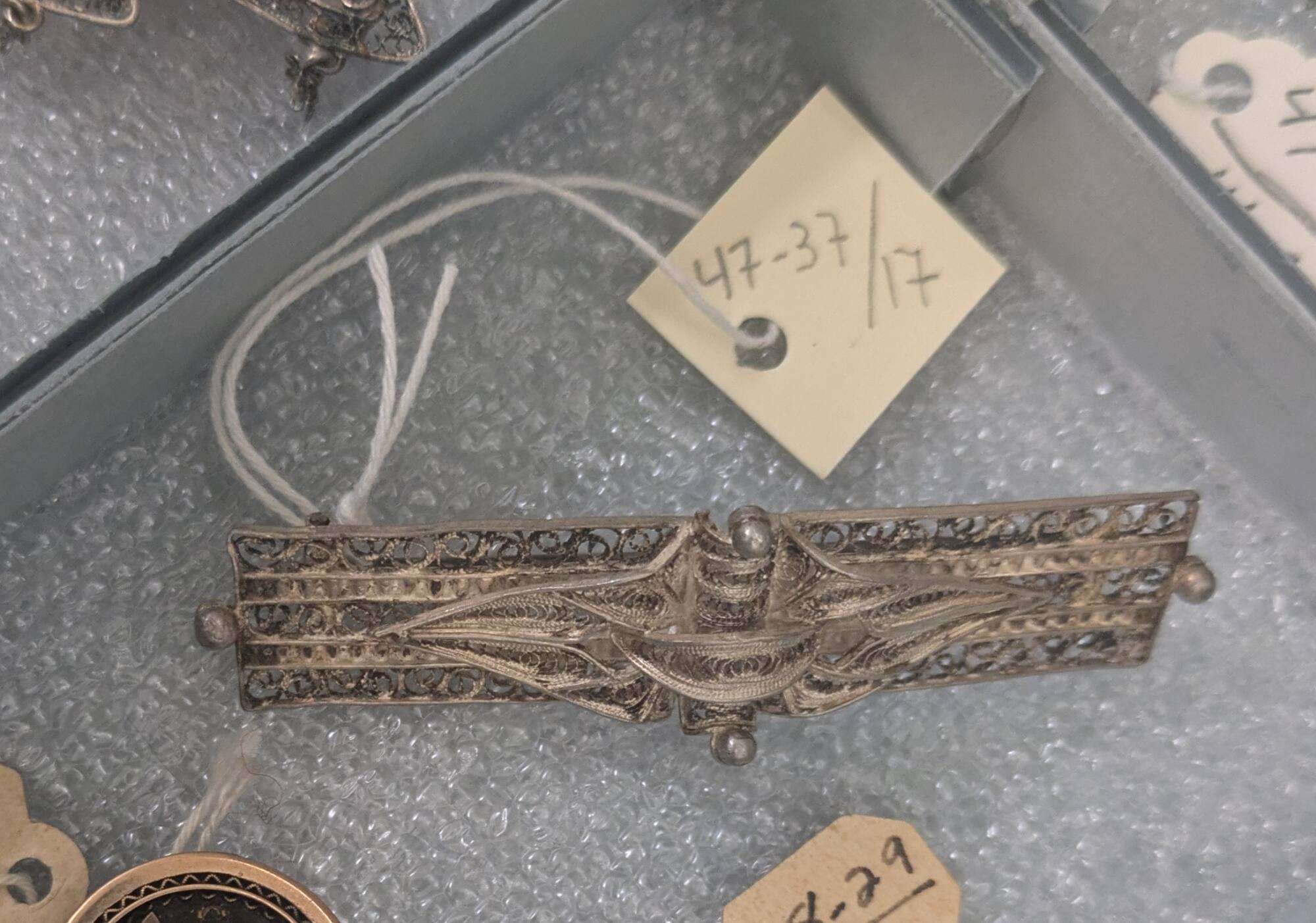 DescriptionRectangular silver filigree brooch, scroll background, with raised diamond shaped center.