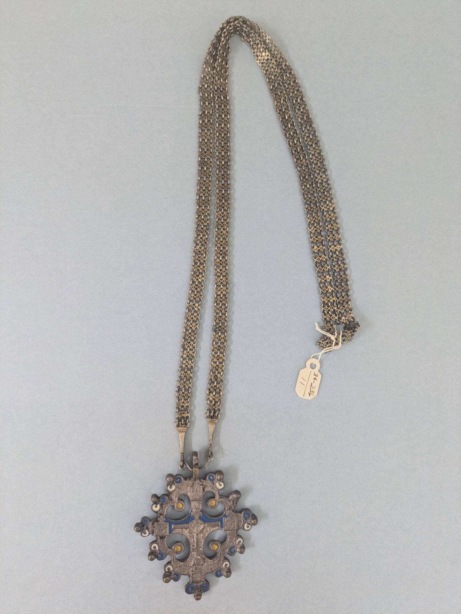 DescriptionSiliver mesh chain with silver and blue enamel cross.ProvenanceElla Anna Loose (née Clark, 1860-1945), Kansas City, MO, and Washington, DC, by 1934 [1];
