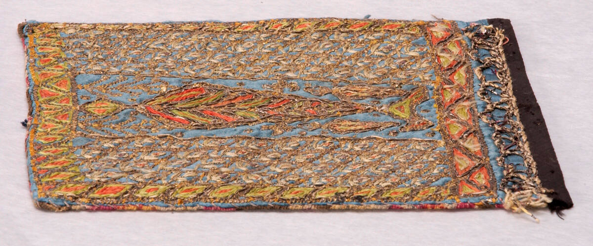 DescriptionLight blue background, cone design in gold thread, orange, green, and white.Exhibition HistoryNo exhibition history known at this time.