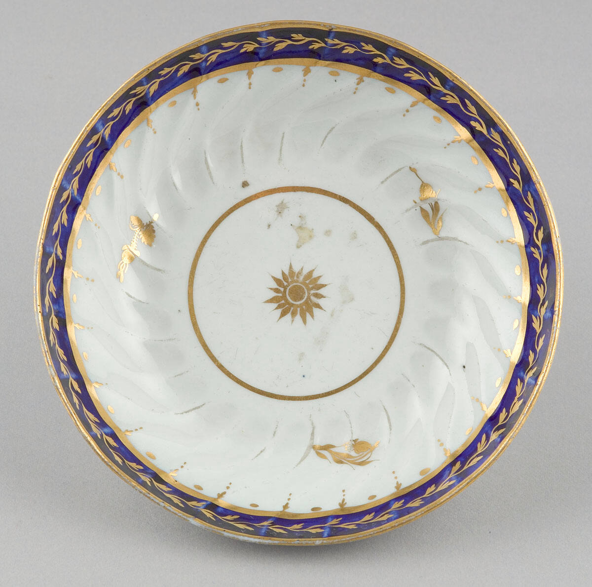 DescriptionWhite porcelain body with fluted cavetto. Dark blue border on rim edged in gold with gold foliate pattern through center of border. Centered sunburst pattern enclosed by gilt circle; three gold flowers. (Gold paint badly rubbed.)