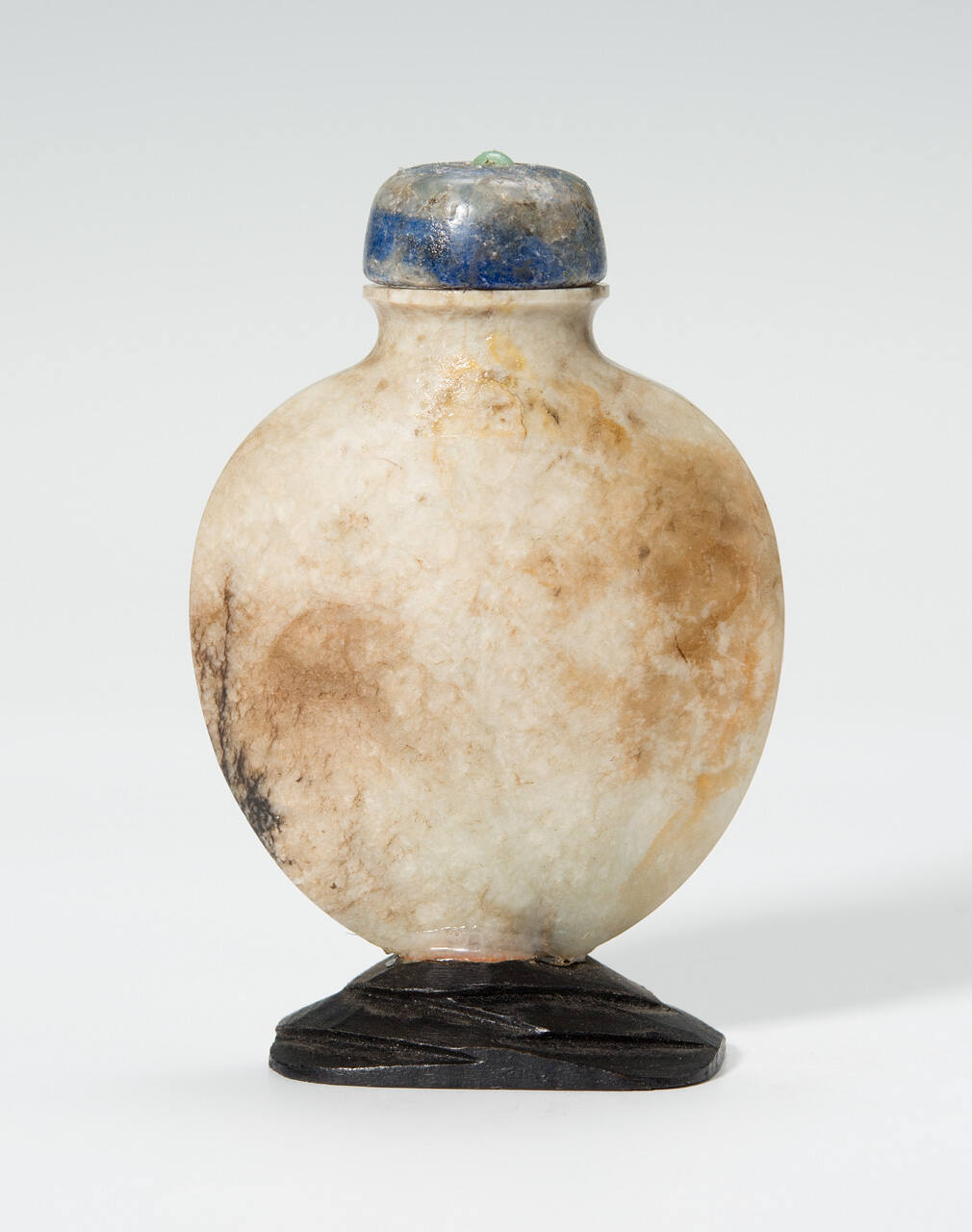 DescriptionFlattened heart-shaped with tapering edge chicken bone jade bottle with black suffusion and brown marks, lapis lazuli stopper.