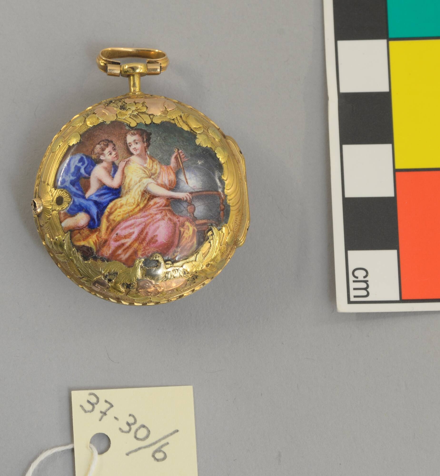 DescriptionWatch with hinged gold case. Elaborate border of yellow, green and pink gold floral and bird design. Enamel center of woman and child with globe. Rounded crystal, white face and Roman numerals. Made by N. Balthazar, Paris.