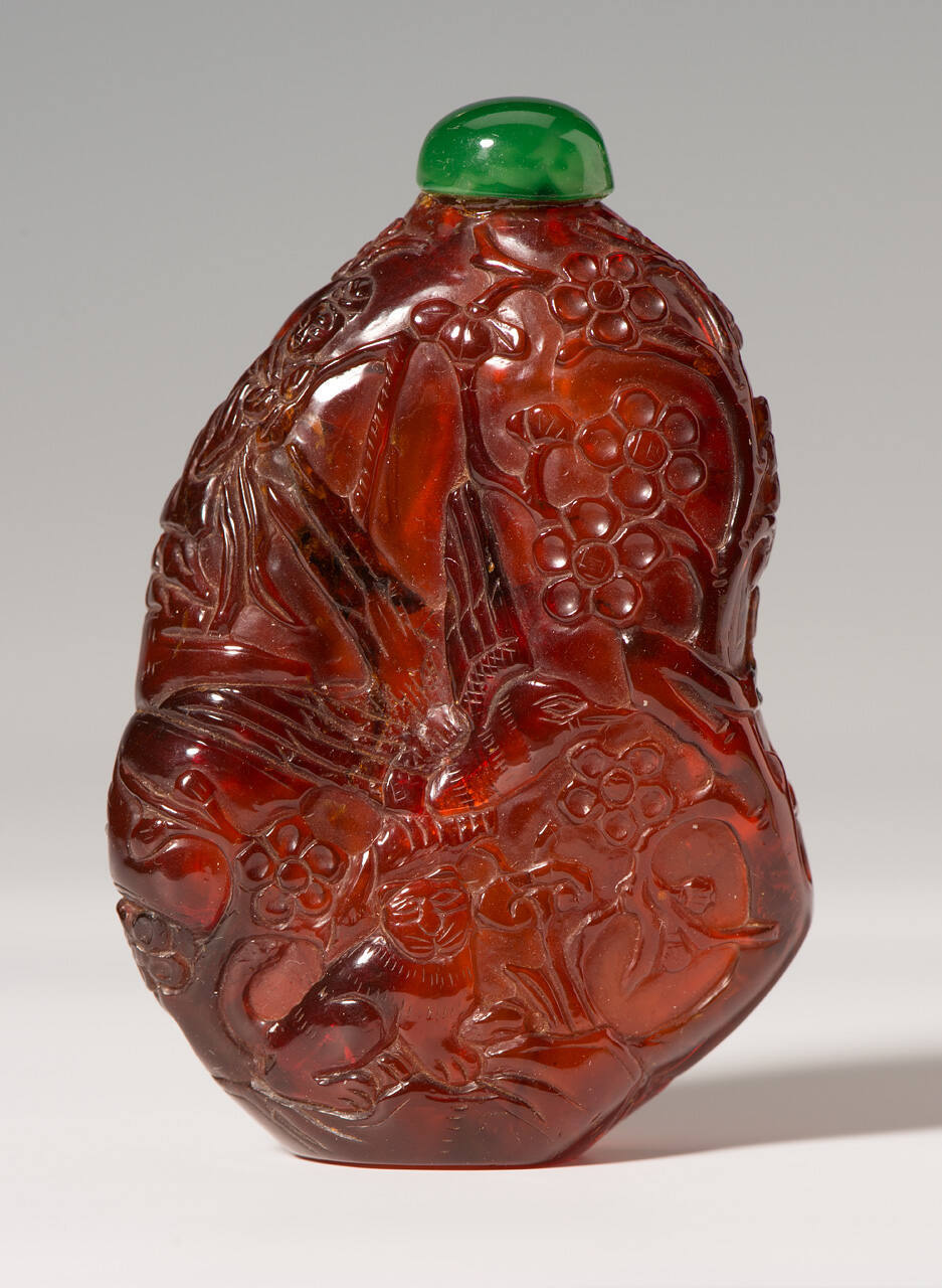 DescriptionPebble-shaped bottle carved in relief with a plum tree, a bird in flight, a tiger standing on rock work among ling-chih fungus and a boy sitting on a rock above watching, the reverse carved with a warrior riding on a horse on a mountain pass underneath, with two attendants following the procession with ling-chih fungus and rock work, green glass stopper.