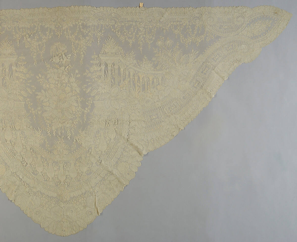 DescriptionTriangular-shaped shawl, net background, design of double collonade and cluster of flowers in center.