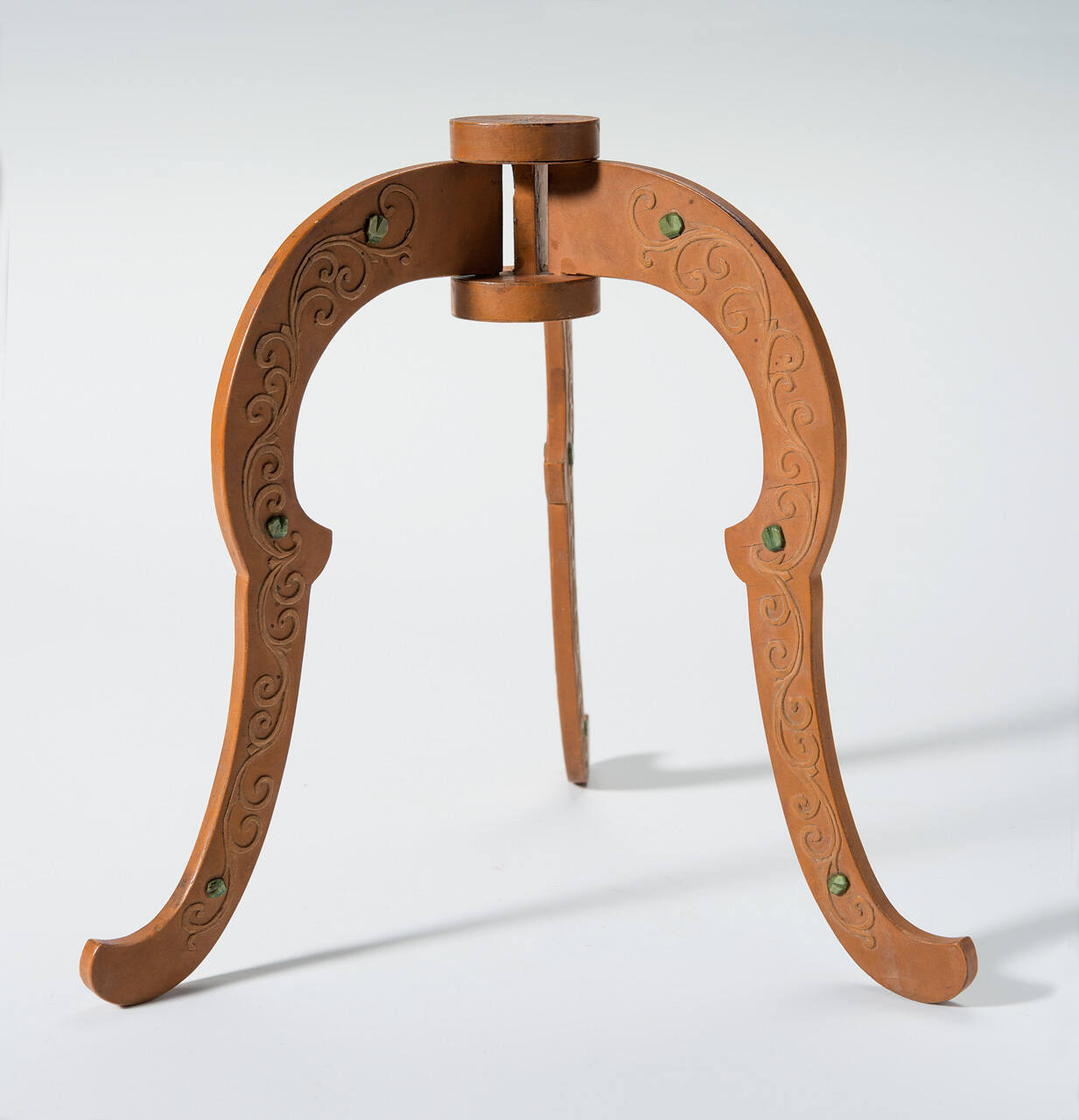 DescriptionFolding tripod in scroll design, made of light wood, carved.
