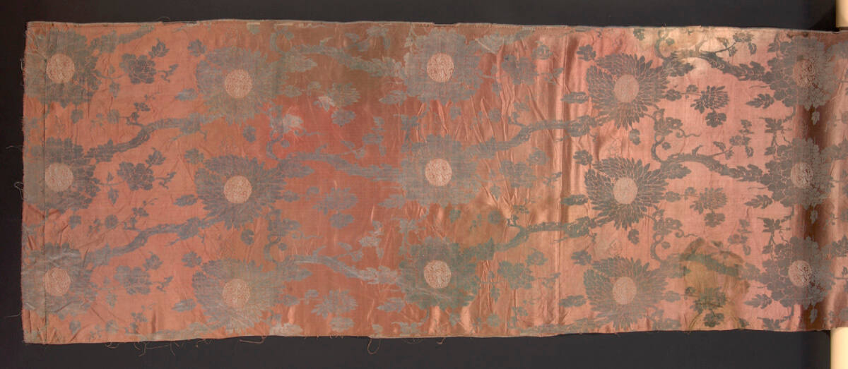 DescriptionChrysanthemums and hawthorn branches in a running pattern, blue on aubergine ground.