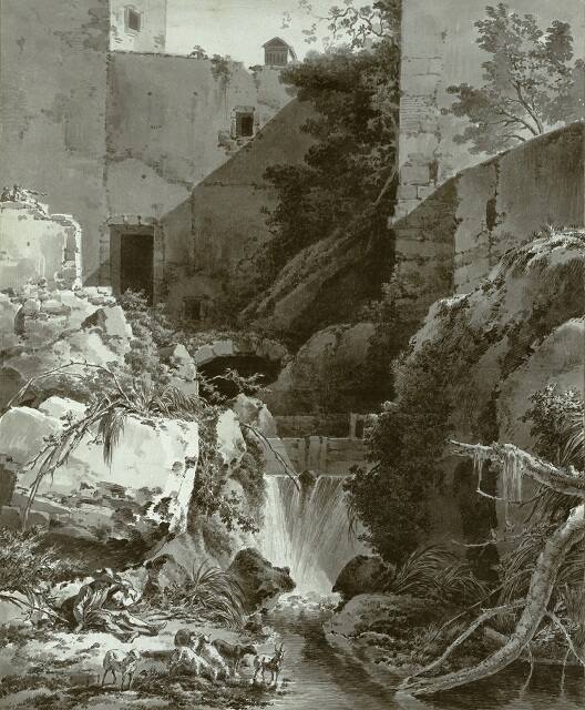 Versteigerungskatalog 177: Handzeichnungen alter Meister des XV. bis XVIII. Jahrhunderts aus den Beständen der Eremitage zu Leningrad (Leipzig: C.G. Boerner, May 4, 1932), 2, as Blick auf einen Wasserfall an einer Hausmauer. Im Vordergrunde ein Hirt mit Tieren.