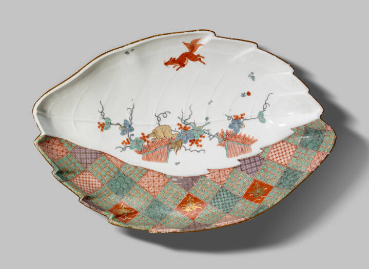 DescriptionKakiemon pattern; vessel formed by overlapping leaves; upper part painted with vines and flowers, squirrel and flying fox; lower part with checkered pattern in yellow, green, red, puce and gilding; eight groups of painted flowers on underside; crossed sword mark in blue on bottom.