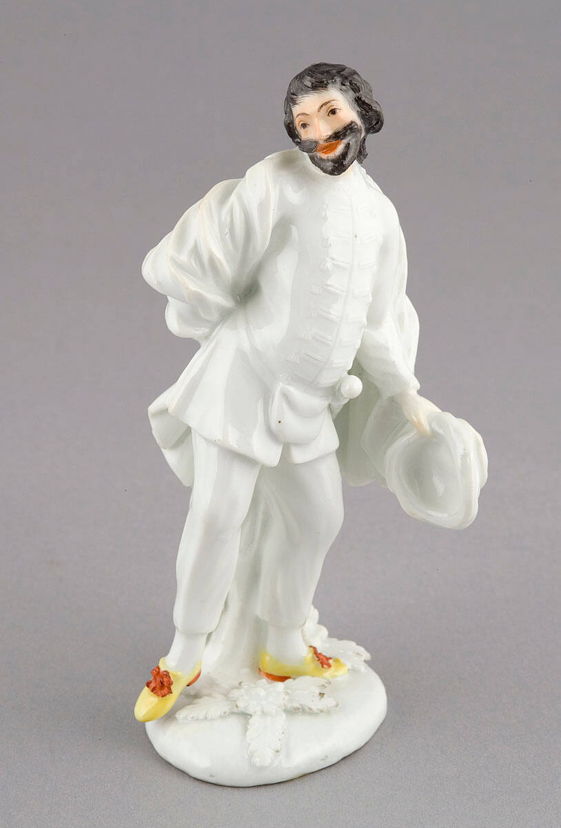 DescriptionFigure partially supported by white tree trunk on circular base; stands on left foot with right foot raised, looks to right. The figure has black hair, mustache, and beard. They are clad entirely in white, with cloak, buttoned jacket, and pants. The figure holds hat in left hand; pouch and sword secured to belt; yellow shoes with red rosettes and heels.