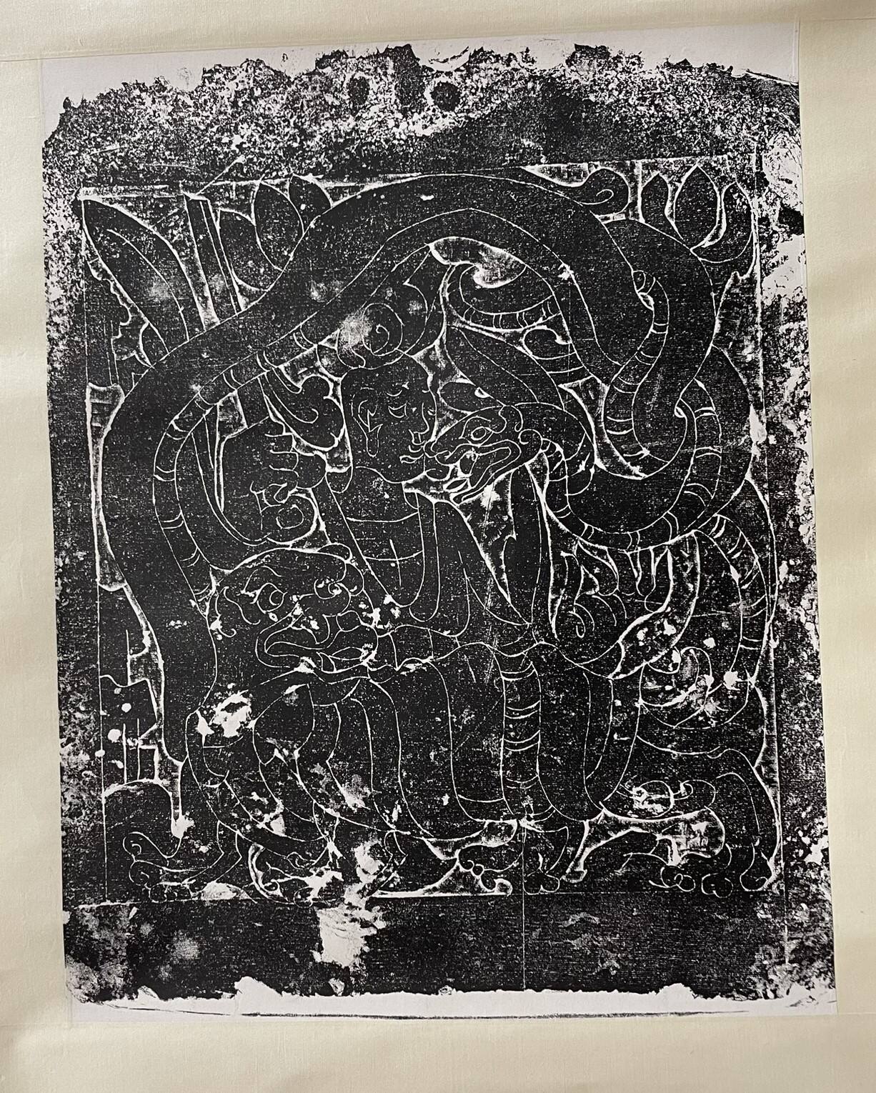 DescriptionSeated figure surrounded by snake (guardian of the north(?)); lower left, seated animal.