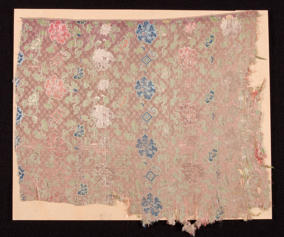 DescriptionGreyish lavender satin brocaded in blue, green, rose and white. Design of small peonies, chrysanthemums and tendrils.