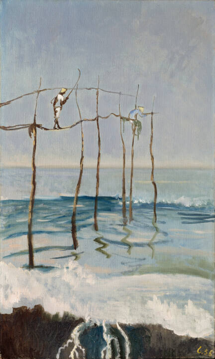 DescriptionThe painting is a vertically oriented seascape, light blue-gray in overall tonality, which depicts two figures "angling" off the edge of a flimsy bridge. A bit of coastline is visible along the bottom of the composition.Published ReferencesNone.