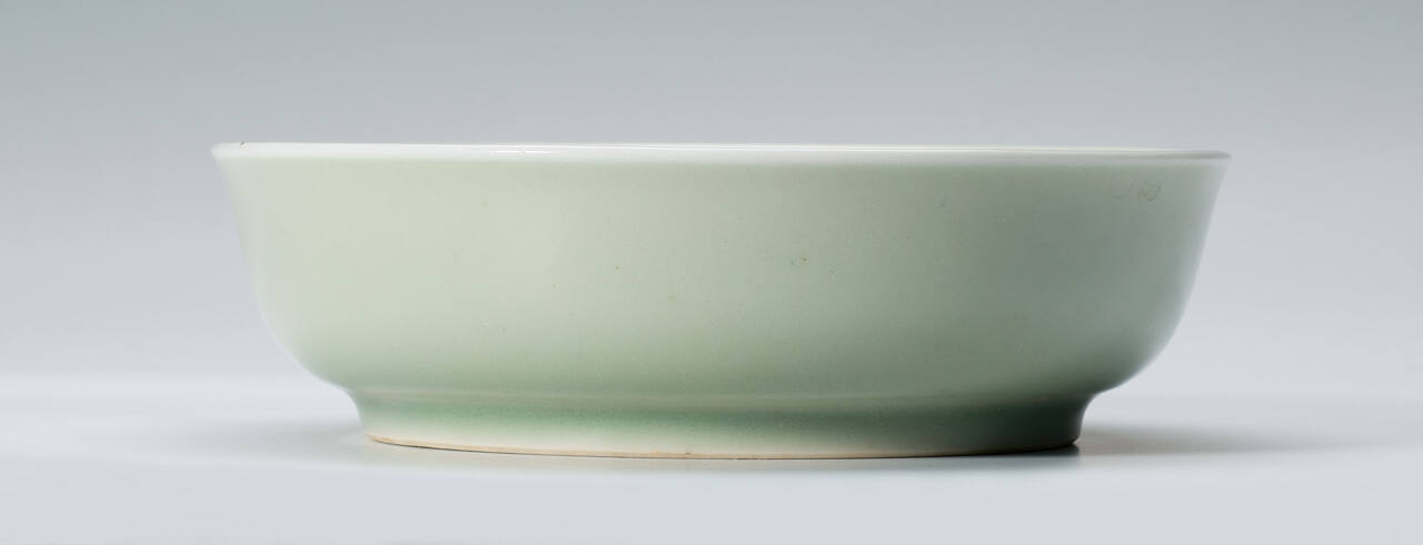 DescriptionOne of a pair of shallow bowls with a pale celadon glaze overall and a narrow white band of glaze around the lip.