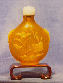 DescriptionPeking yellow glass bottle of moon shape, overlaid with yellow lotus on both sides, animal mask and ring handles, mother-of-pearl stopper.