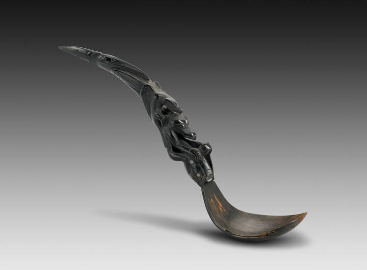 DescriptionHandle carved to represent a wolf holding a head, an eagle, and a raven.Provenance