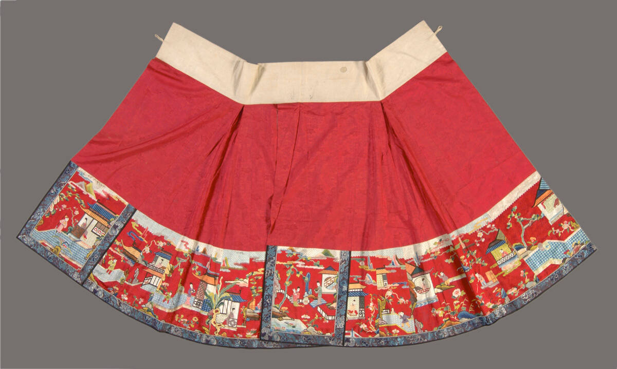 DescriptionSkirt with a white waistband above a wide band of bright red damask. Along the bottom is a wide border embroidered with houses and figures in a landscape, done in a Florentine stitch on gauze. The skirt is divided into two sections. Lined in blue.