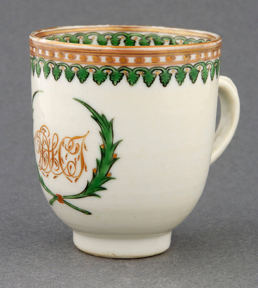 DescriptionSmall cup of white porcelain with handles, decorated on the inside and outside edges with a band of enameled green and gold leaf designs. On the side is a wreath encircling the initials DLCT.ProvenanceMargaret Cameron Chapman (née Mann, 1865-1935), Kansas City, MO, by 1935;