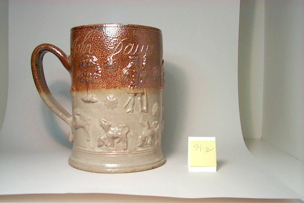 DescriptionUpper half covered with dark brown wash and decorated in low relief with portrait of George II within arcuated square medallion inscribed G II R"; supporters of full-length, standing figures on each side. Inscrived below edge "John DAvis Bargman of Henley 1740." Lower half, white, decorated with hunting scene - equestrian and molded figures of dogs and hare. Molded rosettes on both halves.