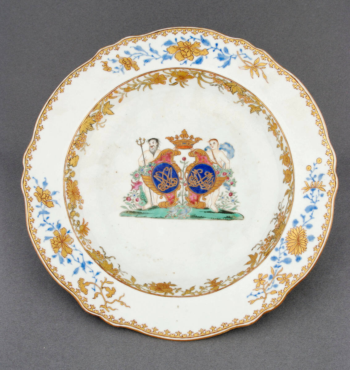 DescriptionBowl with two figures standing beside two shields enclosing an unidentified cipher. Borders of blue and gold floral decoration.