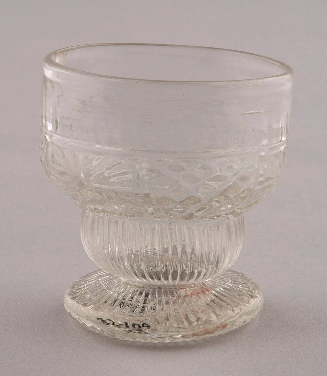 DescriptionBrilliant clear flint glass, tall ogee bowl resting on a circular foot, blown in a small tumbler mould and formed by manipulation.