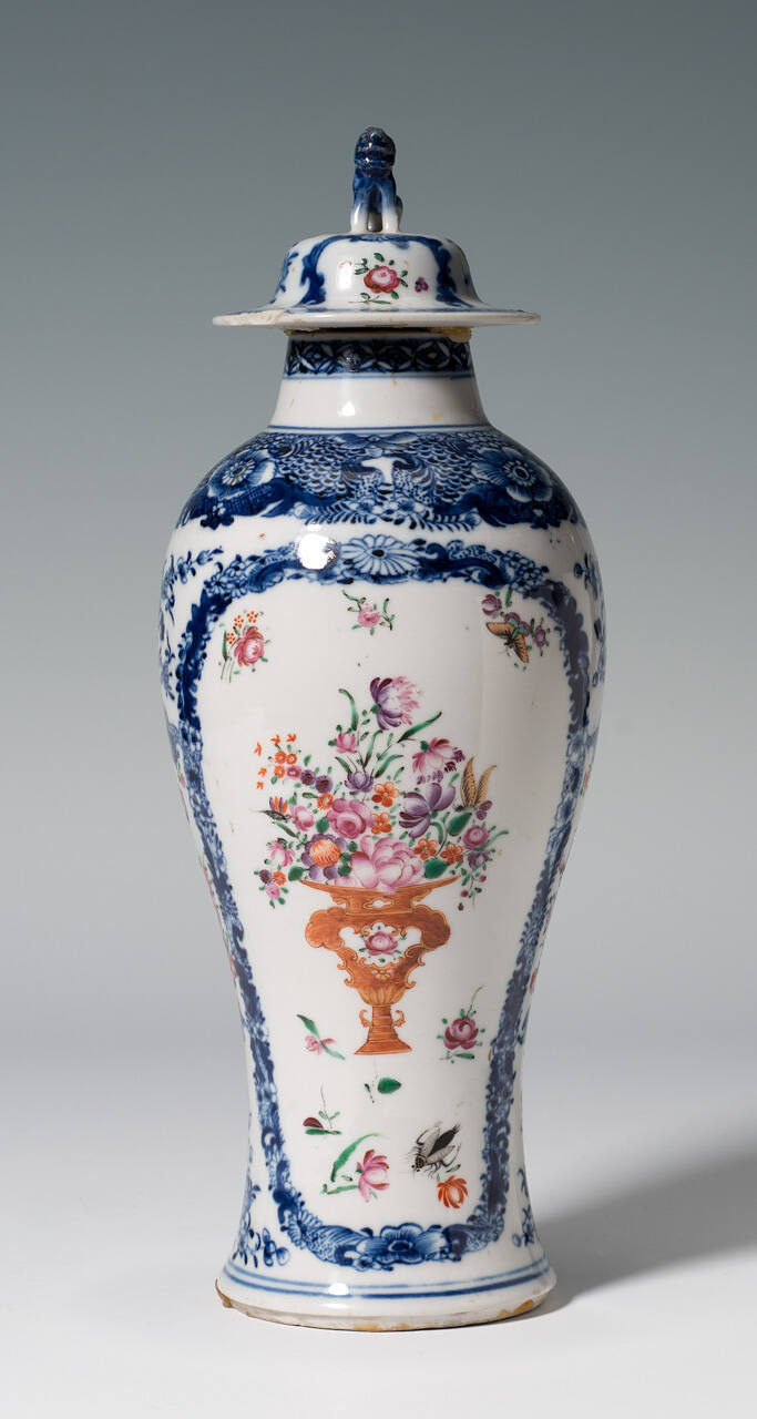 DescriptionBaluster shape with large rectangular borders of blue flowers and leaves on opposite sides; within borders are representations of a vase with flowers and other freely distributed flowers and insects, all in burnt orange, pink, lavender and green. Other borders and flowers in the same colors follow contours of vase. Smallest vase has slight variations in flower configurations and has slightly darker blues. Bell shaped lids with Foo dog on top of each.