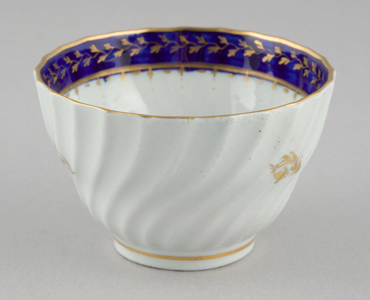 DescriptionWhite porcelain with fluted sides. Interior border of dark blue edged in gold with foliate pattern through center of border. Ring around foot and flowers on body of cup painted in gold. (Gold paint badly rubbed.)