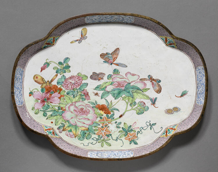 DescriptionChien Lung Canton enamel, melon-shaped plate decorated with peonies, dahlias, morning glories, and with a peony design on the border. With a stand.