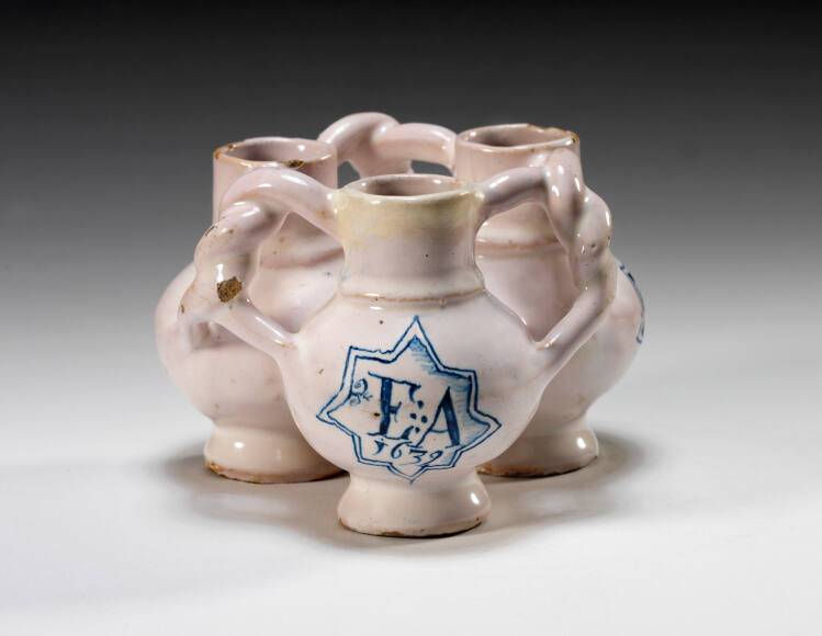 Gallery LabelThese three cups are not only joined by their entwined handles, but are also internally interconnected. With phrases such as "Fill this cup and drink it up" inscribed on other cups of this type, the unwitting drinker was deceived into drinking the contents of all the cups, rather than only one, thus leaving the drinker in a be-"fuddled" state.