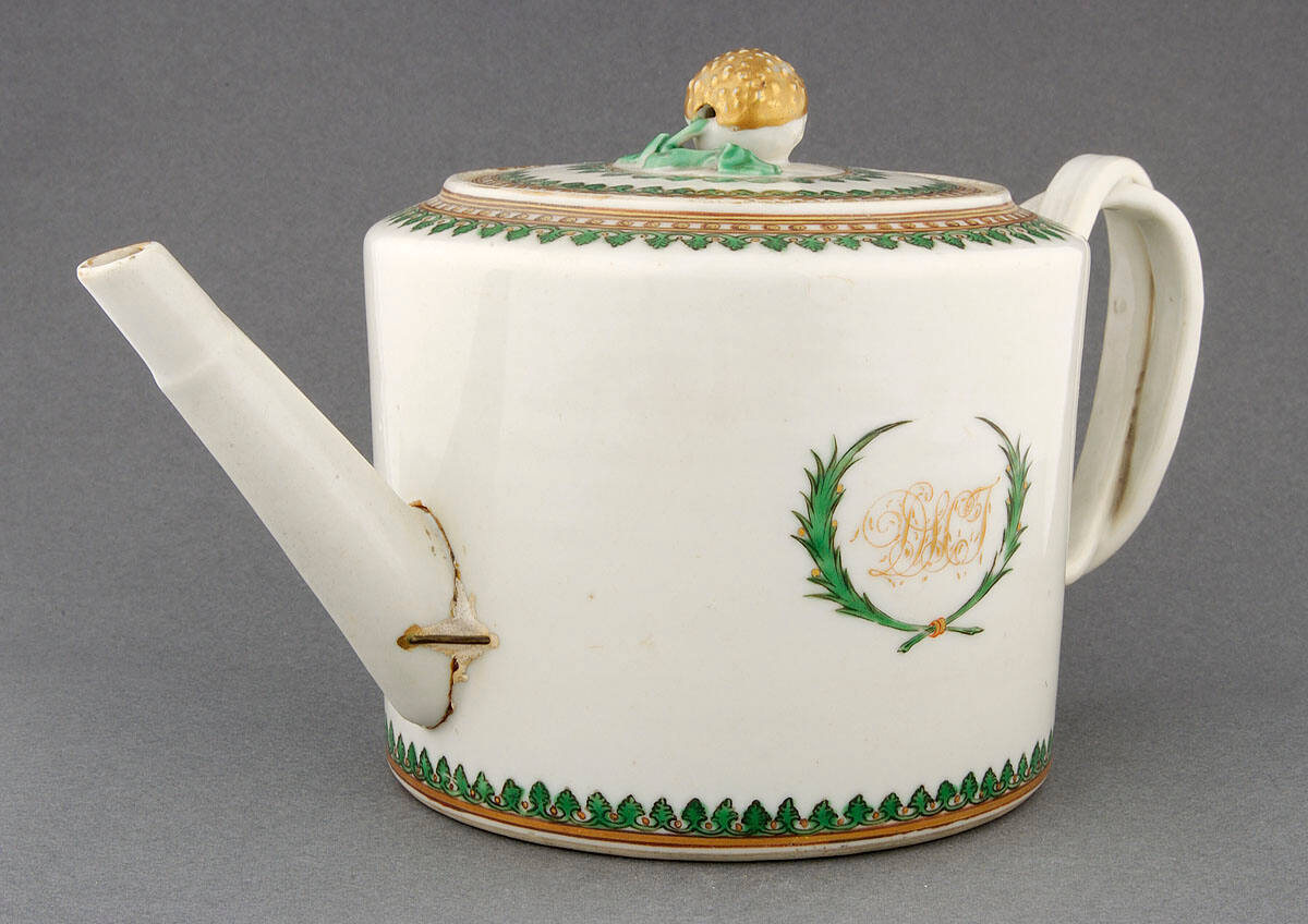 DescriptionTeapot with lid of white porcelain, cylindrical in shape, decorated with bands of enameled leaf designs in green and gold. On either side is a wreath encircling the initials DLCT. The lid is decorated with two bands of enameled leaf designs, and a handle in the shape of a strawberry.ProvenanceMargaret Cameron Chapman (née Mann, 1865-1935), Kansas City, MO, by 1935;